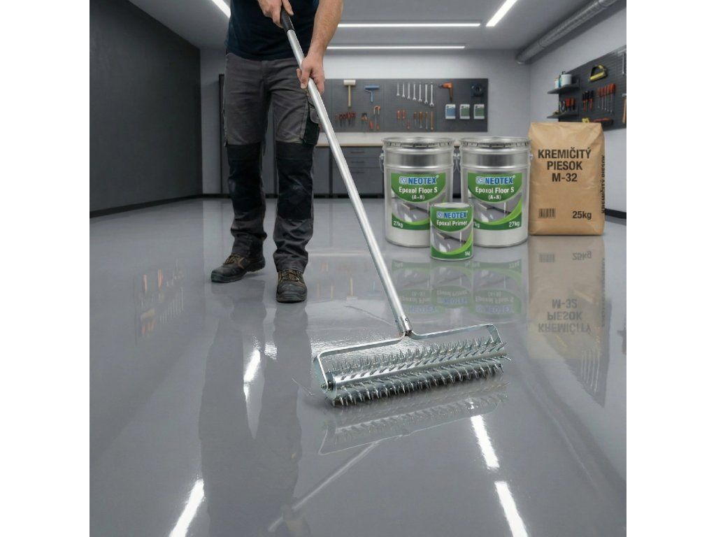 - Önterülő padló: Keverje össze az Epoxol Floor S-t, öntse a felületre és tüskés hengerrel terjessze szét egyenletesen. Teljes kikeményedés 7 nap.